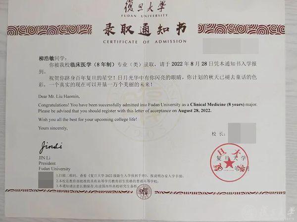 原来这封信的主人是2022级复旦大学临床医学专业本科生柳浩敏