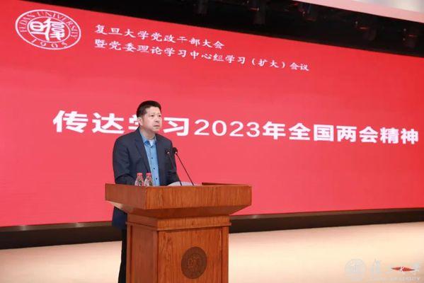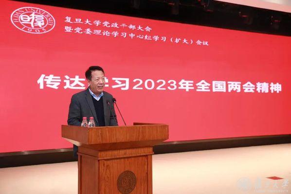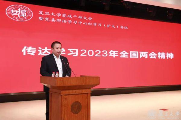 3月14日下午,复旦大学召开全校党政干部大会暨党委理论学习中心组学习(扩大)会议,传达学习2023年全国两会精神。校党委书记裘新主持会议并作总结讲话。