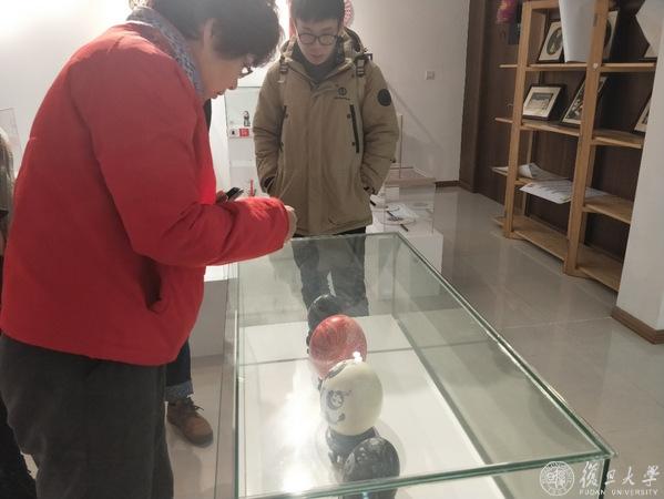 海派蛋雕传承人房清芳老师(左)向刘彦(右)等调研组成员介绍她的作品。