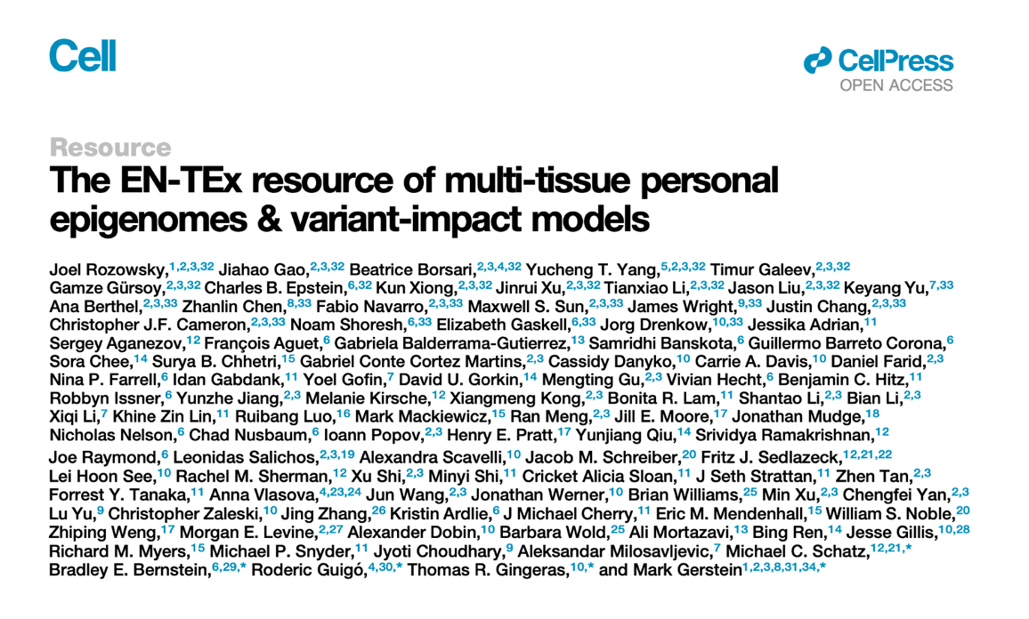针对以上问题,“DNA元件百科全书计划”(EncyclopediaofDNAElements)启动了大型协作计划EN-TEx项目,旨在利用个体表观基因组图谱对基因表达调控进行了细致分析,该项目由美国耶鲁大学领衔,全球31个机构超过100位合作者共同参与,美国耶鲁大学、中国复旦大学、美国Broad研究所等单位的11位科学家作为主要贡献者并列论文共同第一作者。