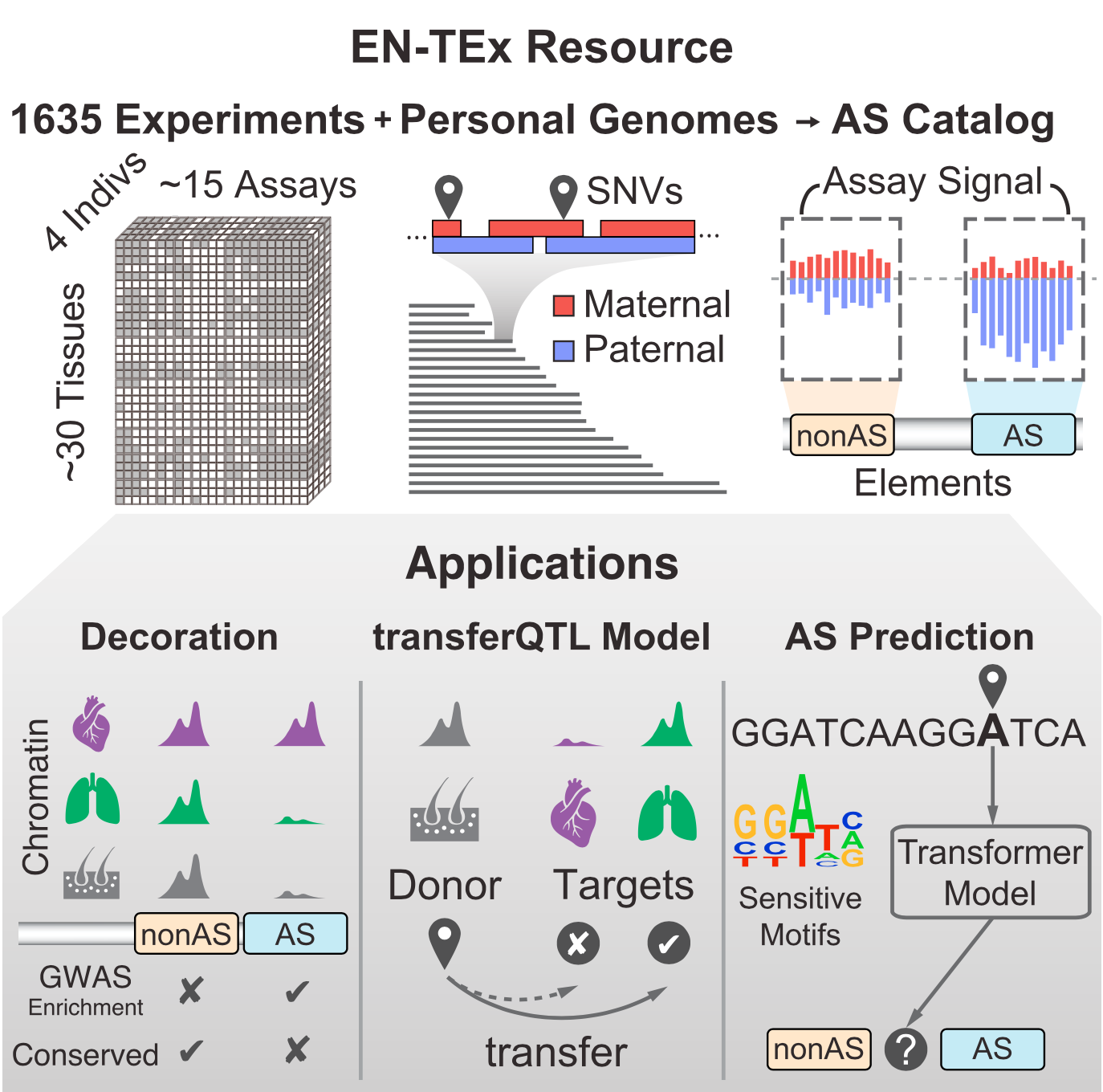 EN-TEx数据集使得研究人员能够系统地确定个体之间与组织之间等位基因特异性的基因表达与表观遗传修饰。例如,H19基因只在来源于母本的单倍型中活跃表达,而与之临近的IGF2基因只在来源于父本的单倍型中活跃表达,而这种等位基因特异性正是由于IGF2基因上游处的一个调控区域在父本、母本单倍型中DNA甲基化的差异性所导致的。杨禹丞博士作为EN-TEx项目的核心研究人员,主要负责将等位基因特异性的多组学表观遗传信号与已知的增强子、启动子等潜在非编码调控元件进行整合注释,从而系统构建人类基因组中的等位基因特异性的非编码调控元件目录,并深入研究了其活性与组织特异性以及进化保守性之间的复杂联系;此外,他还将鉴定出的等位基因特异性的非编码调控元件与多种外部数据做整合,包括表达定量性状位点(eQTLs)和疾病的全基因组关联分析位点(GWAS),阐明等位基因特异性的非编码调控元件参与基因表达调控以及与疾病风险之间的潜在关联。可以预期,这个新的表观基因调控元件目录将会对未来个性化功能基因组分析产生重大影响,能更好地支持个性化医疗、基因编辑等。