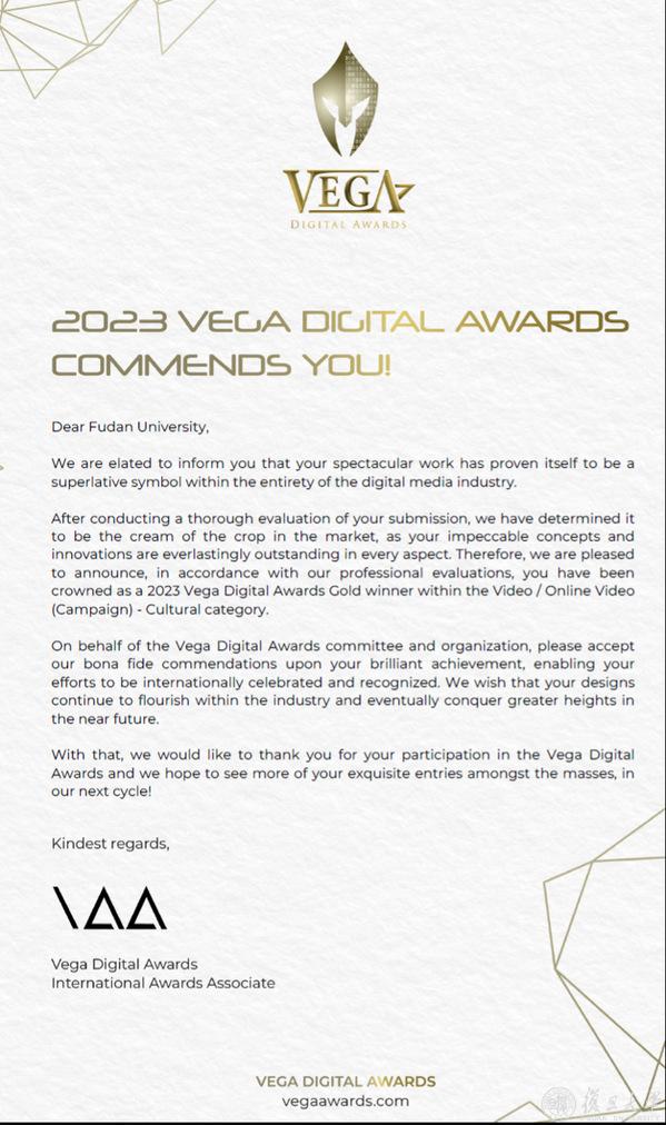 5月12日,VEGA Digital Awards大赛2023年度获奖名单公布,由复旦大学文博数字艺术研究中心柴秋霞教授团队设计执行的“雕画汉韵——寻找汉梦之旅”数字展,荣获VEGA数字媒体设计奖项四项金奖!