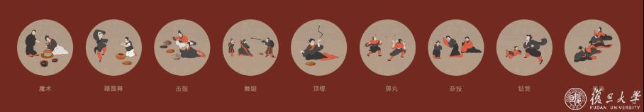 作品“百戏宴乐”正是取材于打虎亭汉墓二号墓中室东段北壁上部的《宴饮百戏图》,形象地表现出汉代贵族和众多宾客的宴饮场面,描绘了观看舞乐和杂技表演时生动热烈的场景。用数字艺术让魔术、踏鼓舞、击鼓伴奏、舞蹈、顶棍、掷丸、杂技、钻筒、伴奏等等壁画上描述的百戏“活起来”,让人体验到汉代集市的喧闹。