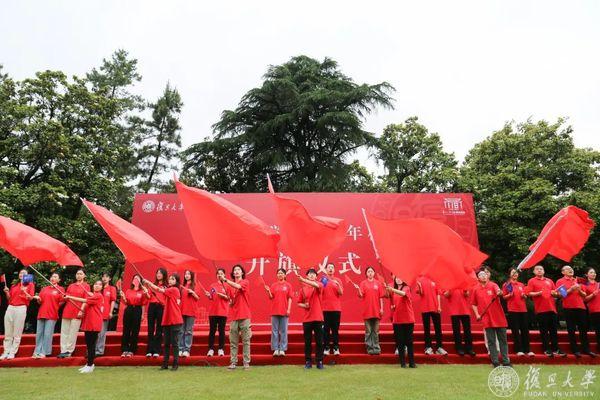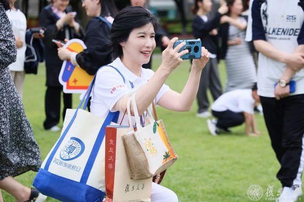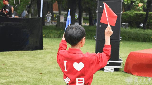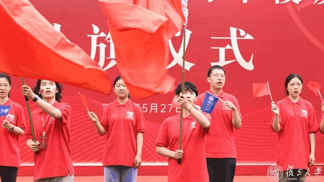 “复旦复旦旦复旦,日月光华同灿烂”,大家挥舞手中的旗帜,在这个特殊的日子,一同唱响共同的校歌。