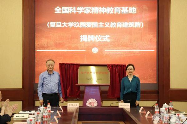 仪式上,张人禾与陈馨为全国“科学家精神教育基地”、“科创中国”复旦类脑智能创新基地揭牌。