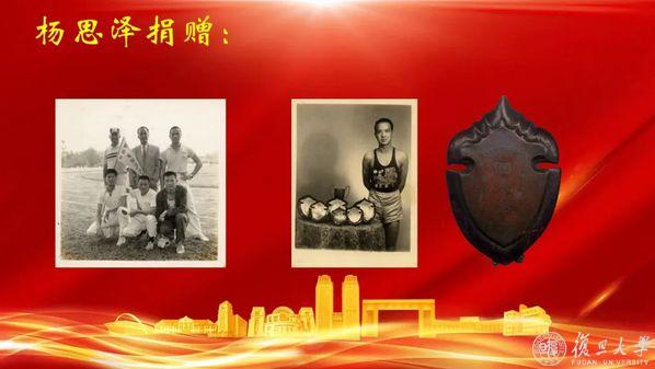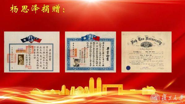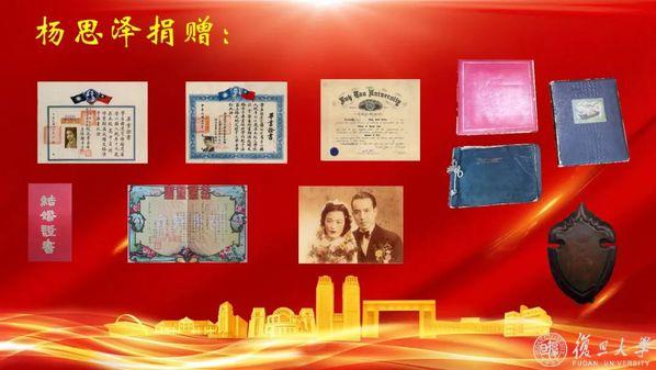 杨庆燮老校友的复旦大学中英文毕业证书、私立复旦实验中学毕业证书、1934年春季复旦大学系际越野比赛个人第一名奖牌,1943年结婚证书以及各类证书、照片等