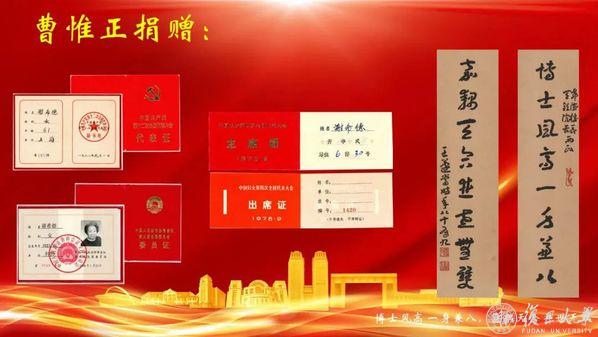 此前,曹惟正校友多次捐赠了谢校长的著作、任命书等多件档案资料。此次回国,又整理出了多件材料捐赠学校。王蘧常先生曾任复旦大学哲学系教授,其书法独开生面,卓然一家,人称蘧书、蘧草,声闻海内外。“博士风高 一身兼八,嘉耦天合 并世无双”,这件书法作品是谢校长夫妇与王先生交谊的见证。同时此次捐赠的谢校长1985年至1992年参加历届党代会、政协会议、妇代会的代表证、出席证等,更是重现了谢校长积极参政议政、尽职国事的履痕和风采。