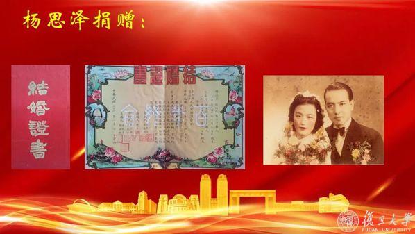 杨庆燮是1931级复旦大学社会学系老校友,于复旦求学期间,亲历了“九一八”事变、“一·二八”事变,作为一名爱国青年,他参加复旦学生义勇军,展露了一位爱国青年抛头颅、洒热血的抗日爱国精神,1932年在虹口公园炸死日军白川大将的炸弹就是复旦化学系教师林继庸带领杨庆燮等人制造的。杨庆燮的复旦大学中英文毕业证书,由时任复旦大学校长李登辉于1936年1月签发;而1934年春季复旦大学系际越野比赛个人第一名奖牌,以最鲜活的珍贵实物展现了复旦独特的体育文化传统,同时也填补了馆藏之空白。更为珍贵的是,此次捐赠的还有1943年杨庆燮与夫人熊嘉珂的结婚证书,征婚人邵力子先生,曾任复旦大学教授、校董。