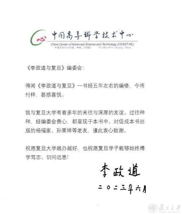 “我与复旦大学有着多年的来往与深厚的友谊”,欣闻《李政道与复旦》付梓出版,李政道先生特意写来贺信,先生代表、中国高等科学技术中心研究员王垂林代为宣读,传达了李先生“祝愿复旦大学越办越好,也祝愿复旦学子能够始终博学笃志,切问近思”的美好祝福。
