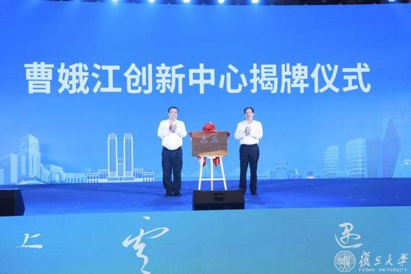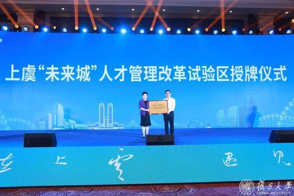 王琴英为上虞“未来城”探索打造人才管理改革试验区授牌,上虞区委常委、组织部部长夏永江接牌;复旦大学校长助理、科学技术研究院院长马余刚,上虞区委副书记、政法委书记许建超共同为复旦曹娥江基础研究基金揭牌。