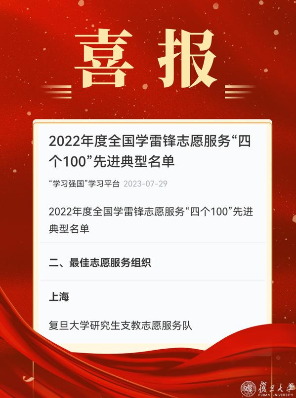 7月29日,2022年度全国学雷锋志愿服务“四个100”先进典型名单公布!复旦大学研究生支教志愿服务队获评“最佳志愿服务组织”。