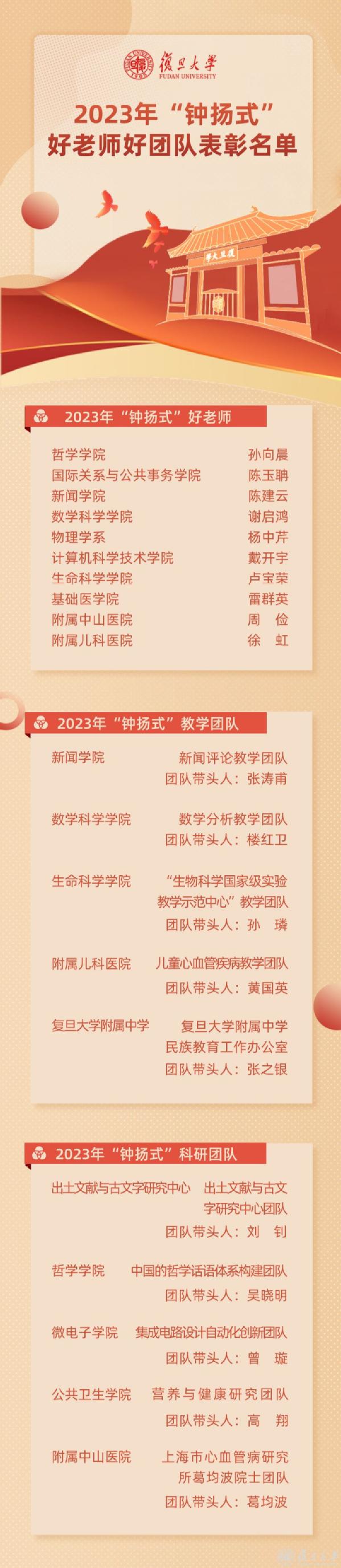 大会现场,2023年“钟扬式”好老师、好团队名单公布,10位“钟扬式”好老师、5支“钟扬式”教学团队和5支“钟扬式”科研团队获表彰。校党委副书记尹冬梅宣读复旦大学党委《关于表彰复旦大学2023年“钟扬式”好老师、好团队的决定》。