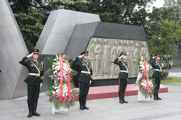 伴随着深沉悠长的《献花曲》,复旦大学国旗护卫队缓步走向烈士雕塑,敬献花篮。红底缎带上的金色大字寄托着全体复旦师生对先烈英雄的深切缅怀与崇高敬意。