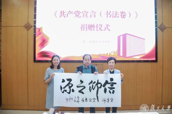 “《共产党宣言》是指引革命道路的宣言书,以书法形式推广中华优秀传统文化,宣传马克思主义真理,是当代书画家应该做、也是必须做的。我认为将书册捐赠给复旦大学望道研究院是合适的。”现场,丁申阳题字“信仰之源”赠送给复旦大学。