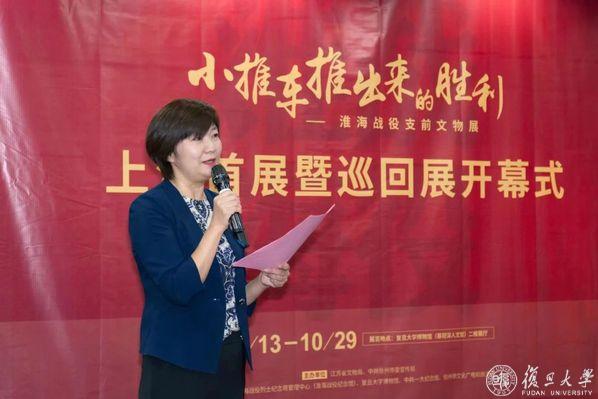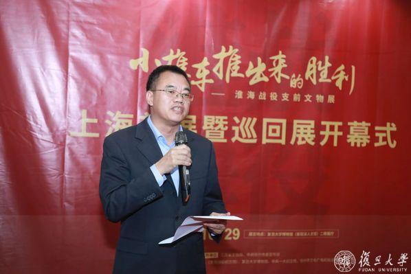 姚文中在致辞中表示,“小推车推出来的胜利——淮海战役支前文物展”作为2023年度江苏省博物馆纪念馆精品展项目之一,是江苏省持续提升文物公共文化服务的具体举措。首展走进复旦大学,是复旦大学和淮海战役纪念馆的一次馆校联动,也是推动新时代革命文物工作与高校思政教育改革创新融合发展的重要成果。将展览送进校园,旨在让广大青年学生直观了解革命历史,了解党和人民群众的血肉深情,激励青年一代树立听党话、跟党走的坚定信念,让青春在新时代新征程上绽放。