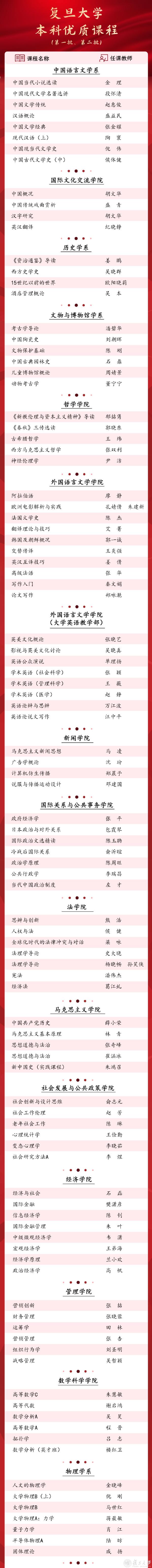 复旦大学自2022学年秋季学期起开展本科优质课程推荐评定工作,围绕课程设计、教学内容、教学方法和教学实效等,重点考查课程的启发性、前沿性和挑战度。经各单位推荐、学生提名与专家评审,现认定复旦大学第一批、第二批本科优质课程205门,其中专业课程125门、大类基础课程27门、通识教育课程53门。