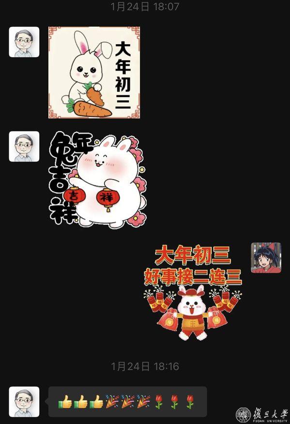 从教多年,卢宝荣带过的学生有近百人,“学术生涯-复旦”是他给学生们创建的群聊。逢年过节,他总是最早发祝福的人,“不但在群里发祝福、发红包,还会给我们每个人私发节日祝福,” 生命科学学院2022级硕士研究生小雨说,“请教卢老师不但事事有回音,那些微信表情让我隔着屏幕也能感受到卢老师像和煦春风一样的笑容。”