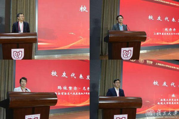 会议现场,4位校友代表,上海市医学会会长邬惊雷,上海申康医院发展中心党委书记赵丹丹,新疆维吾尔自治区人民医院妇产科教授、主任医师玛依努尔·尼牙孜,南通大学党委常委、副校长,南通大学附属医院党委书记、院长施炜先后作交流分享,共抒上医情怀。