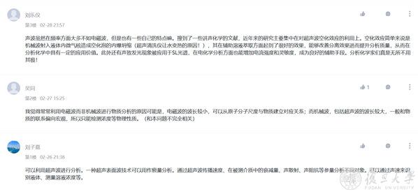 学期初,2021级药学本科生刘乐仪在评论区留下了这门课的第一个问题:“仪器分析常常利用电磁波(如光)的特性,实现不同物质的区分与定量检测,那么有没有什么技术手段是利用机械波(比如声波)的特性的呢?”不久,便有同学在下面跟帖,指明了电磁波和机械波的区别;另一个同学列举了一个利用电磁声波进行物质测定的案例。