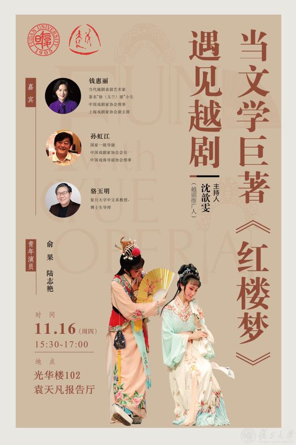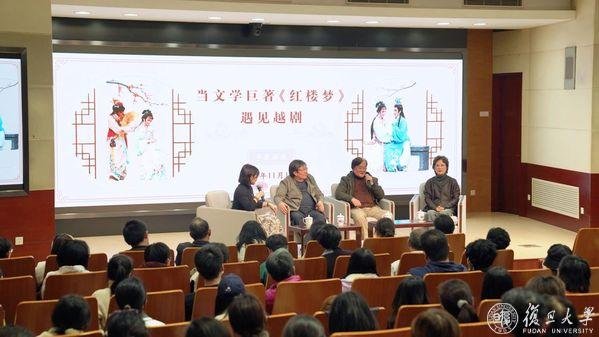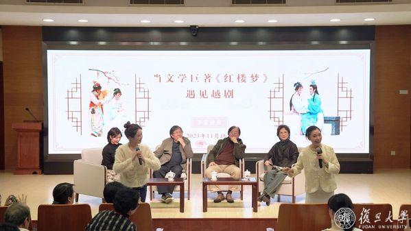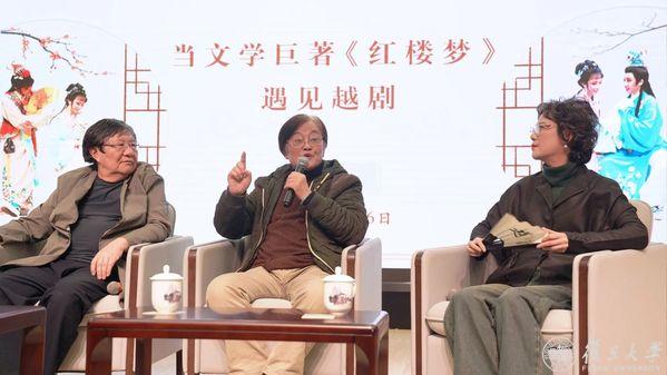 11月16日下午,复旦大学中文系教授、博士生导师骆玉明,国家一级导演孙虹江,当代越剧表演艺术家、国家一级演员、著名“徐(玉兰)派”小生钱惠丽相聚复旦,分别从研究、改编、表演的维度探讨、解读文学巨著《红楼梦》,畅谈当中国古典文学的巅峰邂逅越剧这一艺术形式,是怎样做到传承经典、推陈出新。
