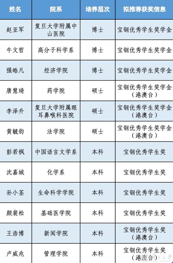 本次“宝钢教育奖”评选中,复旦大学收获颇丰,未来将激励鼓舞广大教师大力弘扬教育家精神,当好学生成长成才的领路人。此前,一批优秀学生获得2022-2023学年复旦大学宝钢优秀学生奖学金,名单公示如下: