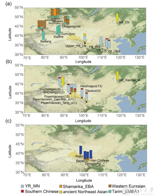 课题组对汉代以前、汉代至唐代、现代等三个时间段的基因组数据进行分析,结果显示,在新石器时代晚期至汉代,河西走廊人群至少发生了一次明显的遗传成分转变,即以齐家文化为代表的黄河上游新石器晚期祖先成分转变为黄河中下游新石器时代晚期/青铜晚期铁器时代早期的祖先成分,这种转变甚至影响到了新疆东部。