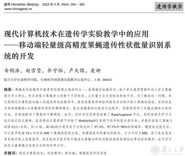 “我觉得有意思,他也很激动,当堂就召集几个同学加入这款名为ClassiFFly的软件开发。”皮妍所说的这款软件,即为安钧浩和同伴历时一个学期设计的果蝇遗传性状自动识别系统,目前已应用于实验课堂教学。只需拍一张照,性状识别结果悉数呈现,他还通过深度学习训练将识别准确率提升至98%。2023年,安钧浩在老师指导下将这一探索过程撰写成文,以第一作者身份发表在《遗传》杂志。