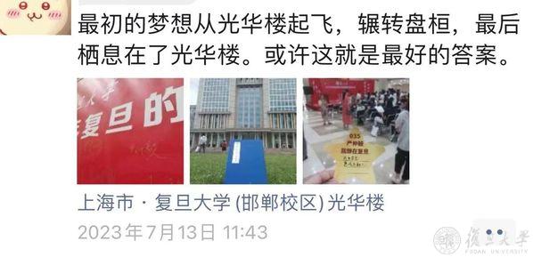 2023年7月,他再次发了一条朋友圈,配文是:最初的梦想从光华楼起飞,辗转盘桓,最后栖息在了光华楼。或许这就是最好的答案。