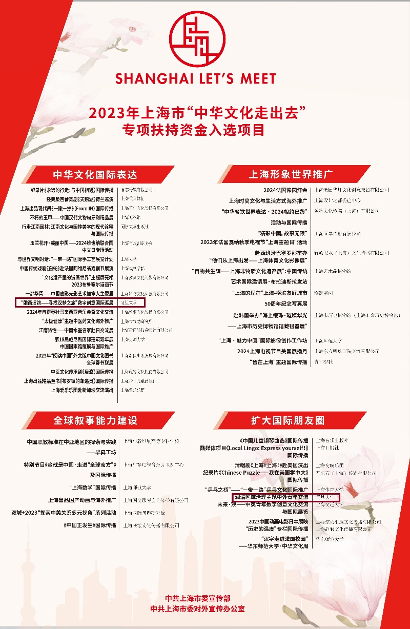 近日,2023年上海市“中华文化走出去”专项扶持资金项目评审和2023年上海市“银鸽奖”评选结果揭晓。经专家评审,复旦大学申报的《“雕画汉韵一寻找汉梦之旅”数字创意国际巡展》《澜湄区域治理主题中外青年交流》等2个项目入选2023年上海市“中华文化走出去”专项扶持资金项目;《<雕画汉韵>全球巡展设计》《澜沧江-湄公河流域治理与发展青年创新设计大赛》等2个项目获评2023年上海市“银鸽奖”最佳奖。