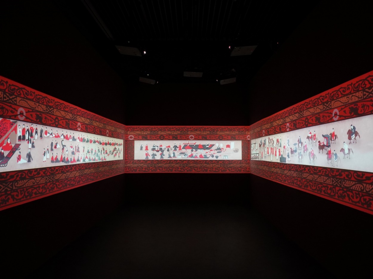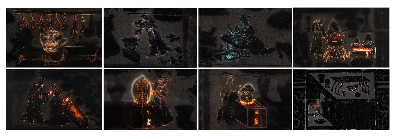 展览共分为“人间”“文化”“信仰”三个部分,共计有数字艺术作品20件。阐释的内容不仅有饱含热情与活力的汉代烟火人间,更有以人间气象为魂的“天人合一”的生死观,涵盖了打虎亭汉墓中“天、地、人、神”的社会故事和精神信仰。在展现方式上,在二次创作中延伸其文化精神与价值内核,将打虎亭汉墓壁画中汉代生活的车马出行、饮食文化、宴饮娱乐等场面通过数字化的手段活灵活现地复现出来,全新的沉浸式观展体验让打虎亭汉墓跃然于观众眼前。