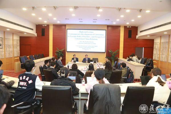 会见结束后,法尔霍德·阿尔济耶夫大使为复旦师生带来题为“乌兹别克斯坦当代发展、外交政策与乌中关系展望”的讲座。他表示,古老的丝绸之路,见证乌兹别克斯坦与中国源远流长的历史交集,近年来两国持续提升经贸、交通、教育、人文等领域的交流合作。中国的“一带一路”倡议强调以互联互通为主线,实现区域联动发展和共同繁荣,而乌兹别克一直希望打破“双重内陆国”的地理劣势,成为连接东西南北的经济、交通和通讯桥梁,两国目标相似、理念契合。去年,“乌兹别克斯坦-2030”战略出台,涵盖5个方面、100项具体目标,他期待两国以发展“新时代全天候全面战略伙伴关系”为契机,在更多领域继续深化务实合作。