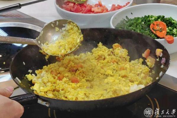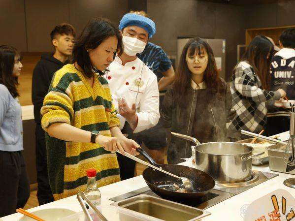 一番观摩后,美食不仅唤醒大家的味蕾,更激发亲手烹饪的热情与兴致,起锅烧油,翻炒搅拌,加料熬煮,在大厨的指导下,同学们渐渐“上道”,烹饪出一道道美味的特色菜。