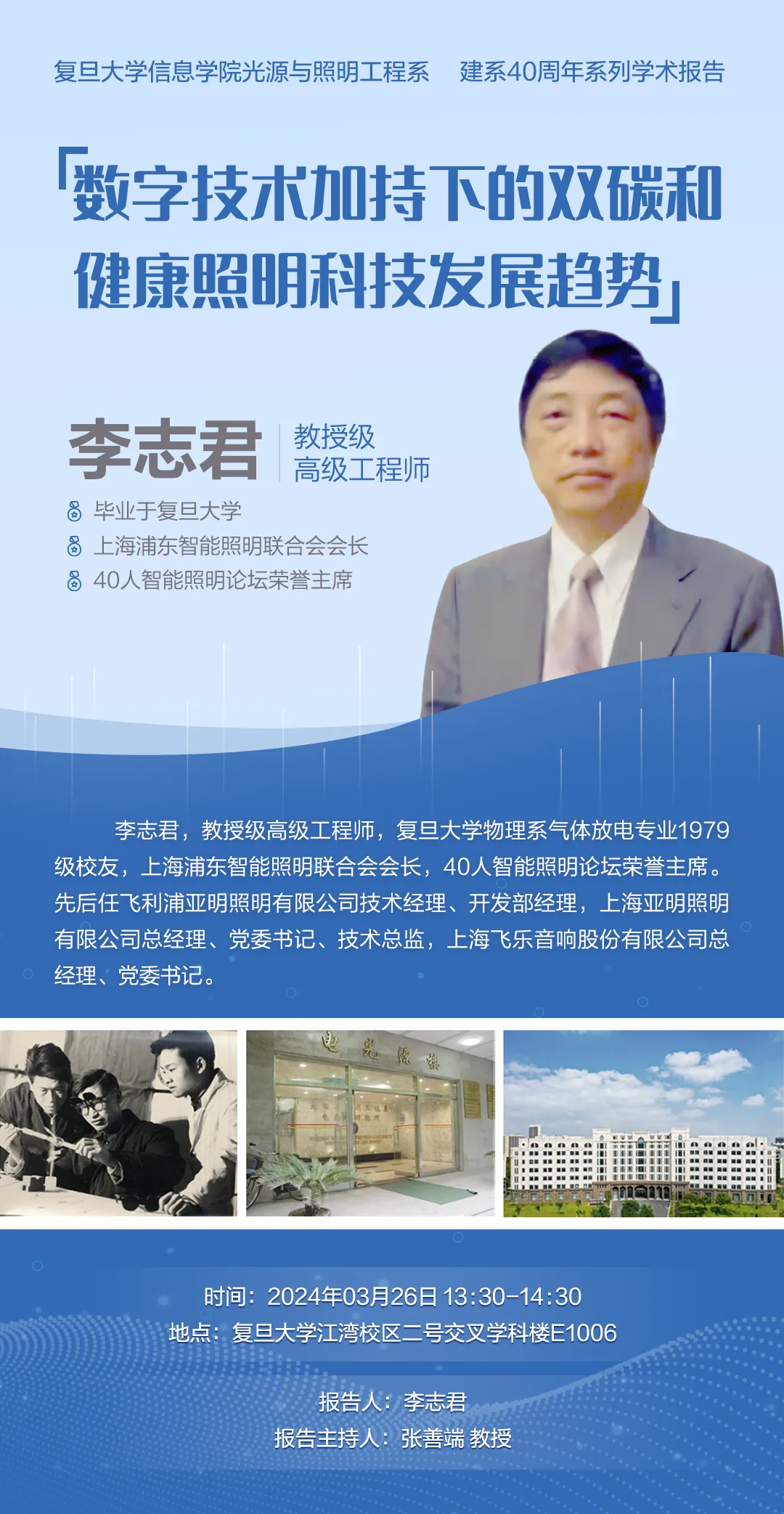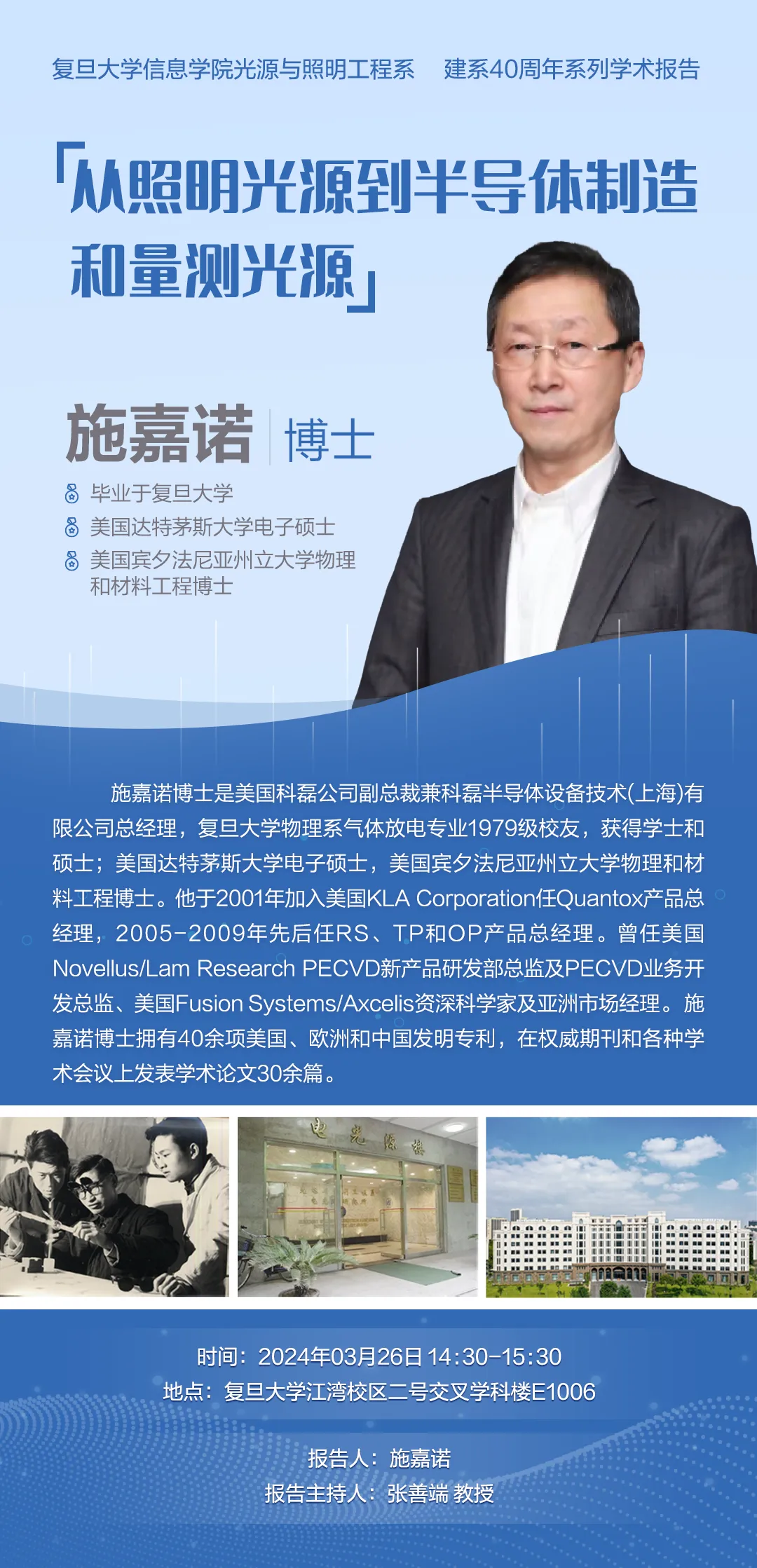 日月光华,旦复旦兮是“复旦”二字的渊源,对复旦光源与照明工程系而言,更是追求光明的梦想。从1960年电光源研究小组筚路蓝缕,至1978年成立电光源研究所及1984年正式建立光源与照明工程系,在蔡祖泉教授的带领下,一代代复旦人秉持艰苦创业、自主创新的精神,为我国照明事业点亮一个又一个“第一”。四十光华,继往开来,3月26日,绿色照明日暨光源与照明工程系建系40周年系列活动正式启动,精彩活动,欢迎参与!