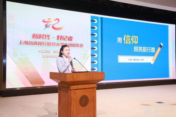 江西广播电视台记者吴萍用洋溪村80多年不灭的灯光、等候75年的军嫂和疫情一线“逆行者”三个故事来诠释“信仰的力量”。她认为,记者的初心使命就是记录真实,传递力量,通过报道真相去凝聚社会力量。她鼓励在座新闻学子,作为未来的从业者,新闻理想不能忘,为人民创作、为时代而歌的信念不能丢,要勇敢战胜各种困难和挑战,用执着和汗水书写形象的中国故事,成为时代的记录者、推动者、讲述者。