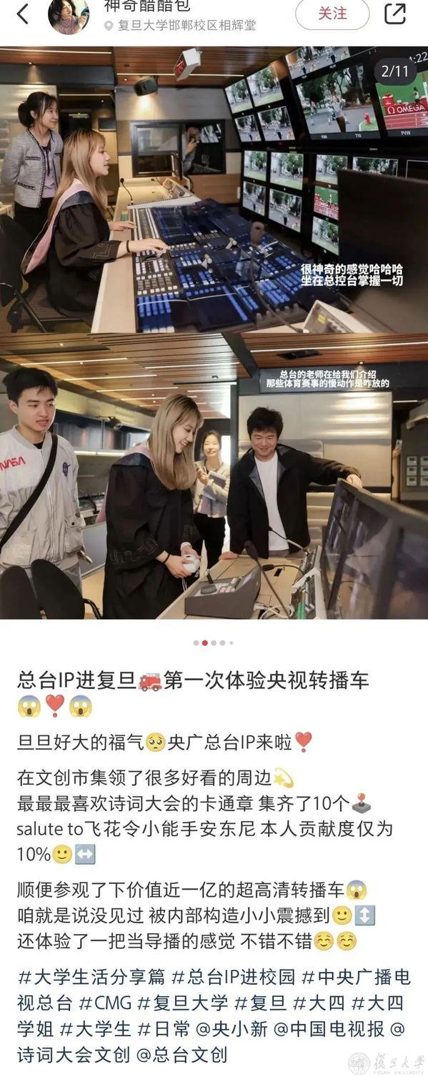 不久前在网上看到了总台IP进人大的活动,当时就在心里想:“好棒啊!什么时候能来复旦!”没想到时隔不久就梦想成真了,而且似乎规模更大体验更丰富哈哈哈。感受就是“梦中情台来到身边了”,很多幕后的故事和“秘密”都得以揭晓。超高清转播车和卫星车停进了校园里,不仅能上车参观、听老师介绍功能,还可以上手操作、亲身体验一番。《中国诗词大会》《相对论》等节目的主创在报告厅开讲,面对面、心交心,“不见外”地分享了很多幕后创作故事。近距离接触后,我真心感受到总台与年轻人们交流的诚意,也对优秀节目的主创团队又添了几分敬意。
