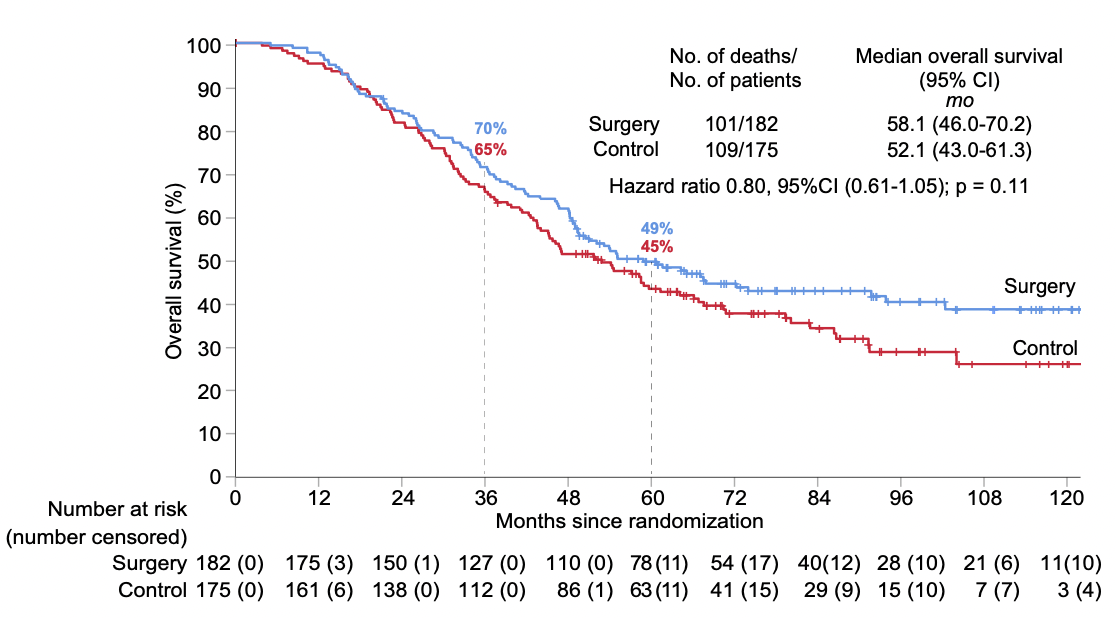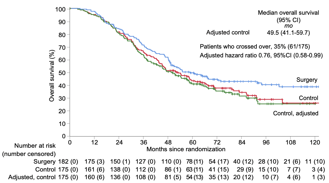本研究共纳入了铂类化疗敏感、未使用过靶向维持治疗、初次复发卵巢癌患者357例,进行了中位数82.5个月的随访。其中,手术组的总生存期(58.1个月)较非手术组(52.1个月)延长了6个月(图3)。考虑有35%的单向转组率,经过统计学方法较正后,手术组的死亡风险较非手术组降低了24%,这一结果进一步证实了手术的获益(图4)。此外,在手术组中,影像学检查发现少于20个癌灶的局限病灶复发患者,手术为其带来的获益最明显,死亡风险降低了31%。