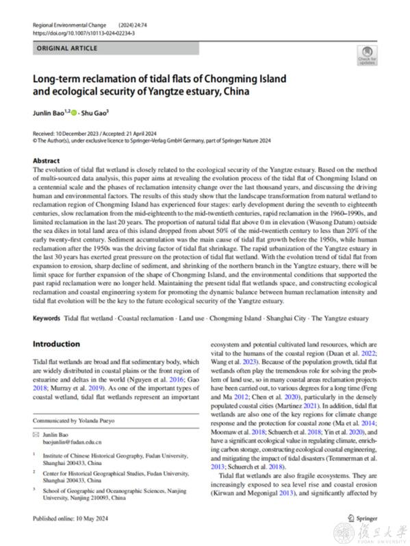 5月10日,历史地理研究中心鲍俊林及合作者在Regional Environmental Change期刊发表题为“Long-term reclamation of tidal flats of Chongming Island and ecological security of Yangtze estuary, China”的研究工作。该研究分析了崇明岛潮滩环境演变和人类围垦变化的历史阶段,探讨了人类与环境因素的驱动影响及差异。从长期自然驱动到工程驱动是崇明岛潮滩演变的主要趋势,伴随气候变化与海面上升、潮滩淤蚀转变,崇明岛堤外潮滩进一步扩大的空间有限,支持过去快速围垦的环境条件不复存在。发展生态型围垦及海岸工程,主动有序地保持潮滩演变与围垦速度及空间分布的动态平衡,是恢复潮滩湿地生态功能、促进长江口生态安全的关键。