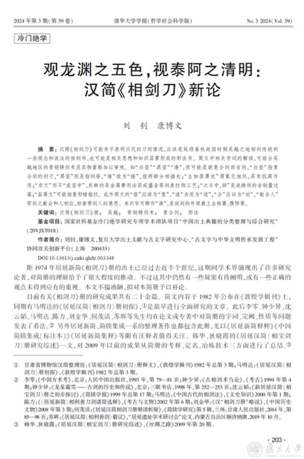 5月15日,出土文献与古文字研究中心教授刘钊、博士康博文的论文《观龙渊之五色,视太阿之清明:汉简〈相剑刀〉新论》一文在《清华大学学报(哲学社会科学版)》2024年第3期发表。文章认为,汉简《相剑刀》可能并不表明汉代的刀剑情况,应该是延续春秋战国时期吴越之地相剑传统的一些观念和说法的相剑书,也可能是相关思想和知识层累形成的形法书。简文中相关字词的解读,可结合吴越地区的青铜铸剑术及实物重新加以审视。如“白坚”“黑坚”“逢”,很可能是就复合剑而言的,“白坚”指复合剑的剑刃,“黑坚”则是指剑脊,“逢”读为“缝”,指两部分相接处;“生如黍粟状”谓氧化蚀坑,具有抗腐作用;“有文”而不“在坚中”,反映的是金属膏剂涂层或鎏金等剑表纹饰工艺;“之日中,骍”是说铸剑的含铜量过高,中午时在阳光下呈现红色;“县薄文”可能指菱形暗格纹。此外简文的“报”应读为“复”、“遂”当用为“逐”、“合”应训为“对”,“敝合人”即剑之敝会和人相应,妨害带剑人的意思。未识字可释作“谯”,是说剑的外观看上去枯薧、憔悴。