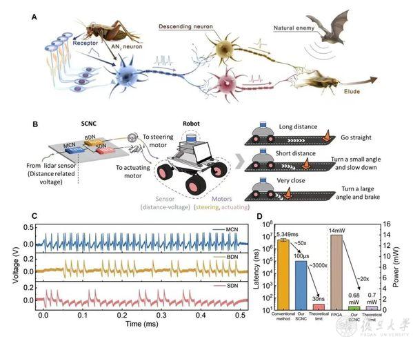 (A)蟋蟀避障相关环路 (B)忆阻神经环路及机器人避障响应 (C)忆阻神经环路特性 (D)与传统方案的延迟及功耗对比