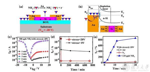 (a) NH₃分子催化反应示意图,(b) 用NH₃+-e-偶极子注入NH₃之前和之后Au/Si界面的能带图,(c)900ppb下高灵敏度测量,(d) 快速脱附的测量 (e) 极低浓度下的灵敏度测量