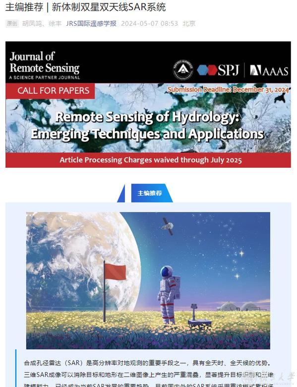 5月6日,信息科学与工程学院徐丰教授课题组提出了面向快速三维成像的新体制星载多星多天线系统,其最新成果以“Conceptual Study and Performance Analysis of Tandem Multi-Antenna Spaceborne SAR Interferometry”为题,发表于遥感前沿期刊Journal of Remote Sensing。成果发表后,在《JRS国际遥感学报》里进行了专栏报道推广。团队针对SAR三维成像对快速多基线数据获取的需求,基于多基线最优设计原则,设计了一种双星双天线SAR系统,通过综合使用双站以及双天线SAR干涉图的优势,实现星载SAR快速三维成像,能够用于目标、植被、建筑等典型场景的三维重建。