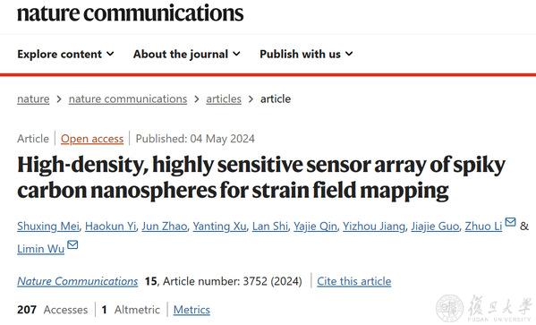 5月4日,材料科学系武利民课题组在前期研究基础上将密堆积的纳米碳球图案化形成超高传感密度(100 pixel cm-2)应变传感阵列。而其粒径的单分散性和密堆积结构也确保了阵列单元间的高度一致性(标准偏差 ≤ 3.82%),为应变场的高分辨率原位测量提供了一种直接而简便的方法,有望在生物力学、结构健康监测和软机器人等领域获得应用。该研究近日以题为“High-density, highly sensitive sensor array of spiky carbon nanospheres for strain field mapping”的研究论文发表在Nature Communications上。