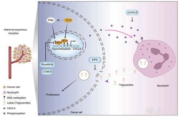 TET2-STAT3-CXCL5信号轴介导的中性粒细胞和肿瘤细胞间脂质转运在肺腺鳞癌转分化中发挥重要作用