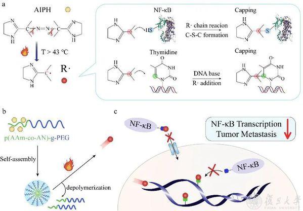 近日,材料科学系/聚合物分子工程国家重点实验室步文博教授、澳大利亚悉尼科技大学金大勇院士和复旦大学附属肿瘤医院何新红主任医师的合作团队,受启发于高分子化学经典的封端反应,首次提出了自由基封端转录因子的抗肿瘤新策略,巧妙利用逆向思维,通过自由基生化反应封闭转录因子活性位点,创新性实现了肿瘤细胞内转录因子NF-κB的高效抑制。该工作已在线发表于Angewandte Chemie International Edition期刊。