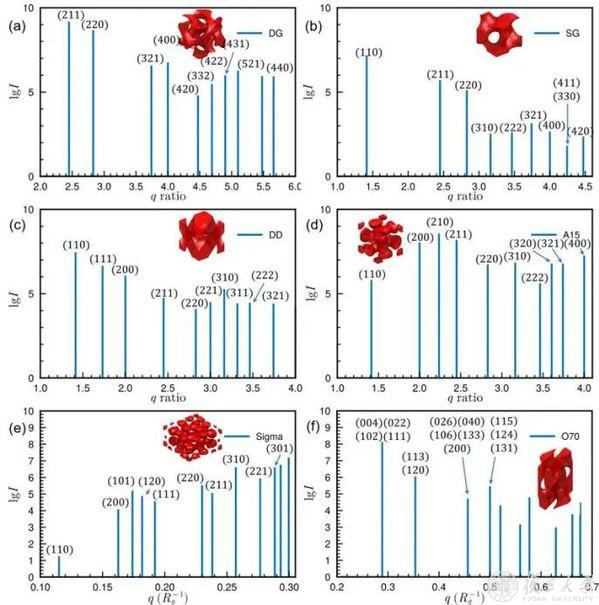 六种典型有序相的散射行为。(a)双连续Gyroid;(b)单连续Gyroid;(c)双连续Diamond;(d)A15;(e)σ;(f)Ο70。