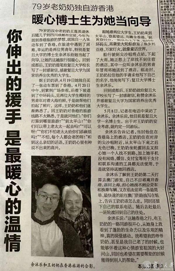 近日,复旦大学收到一封特殊的感谢信。写信人是一位四川79岁的老奶奶:“感谢贵校一名大学生,在我游历香港时给予我很大帮助,他就是新时代的活雷锋。”信中提到的同学就是余沭乐,一名经济学院在读博士研究生。