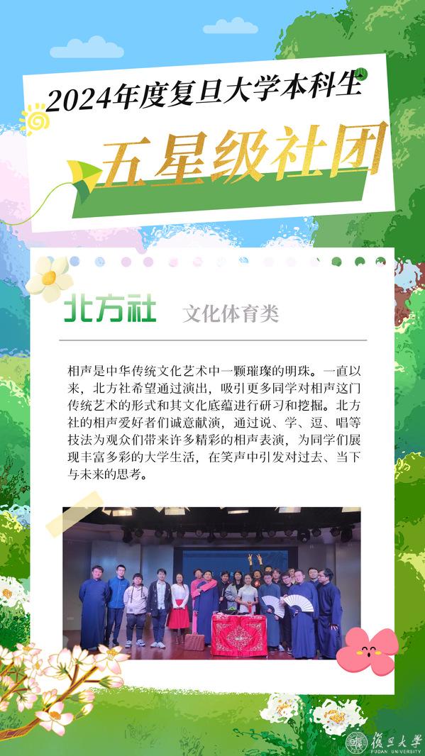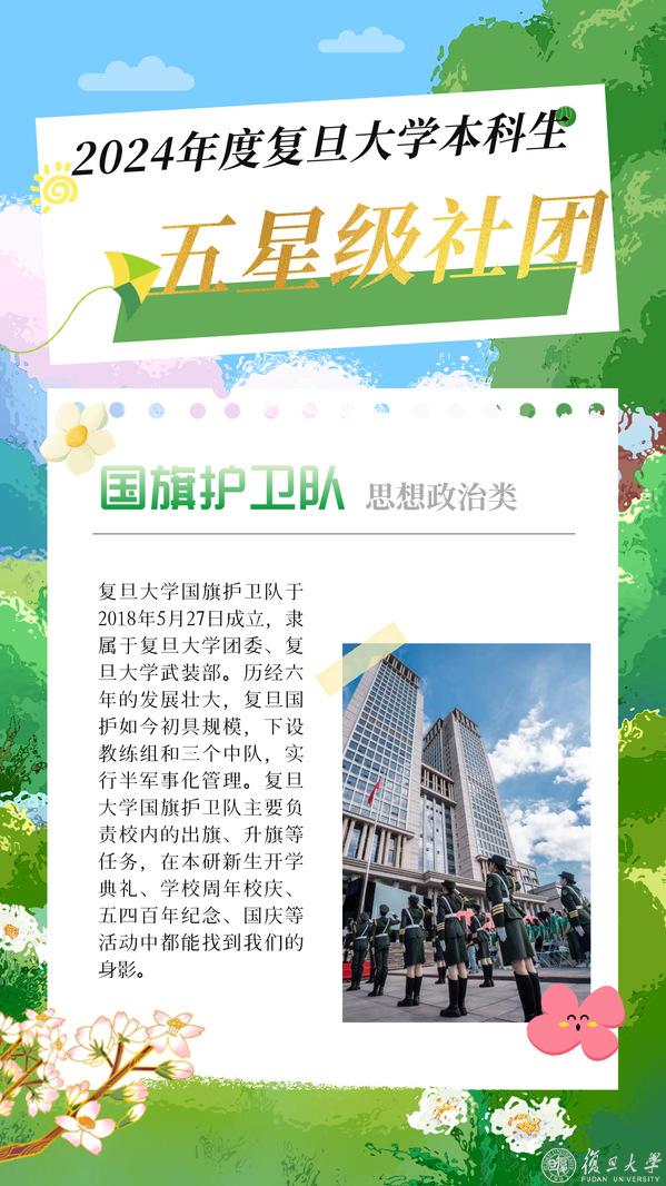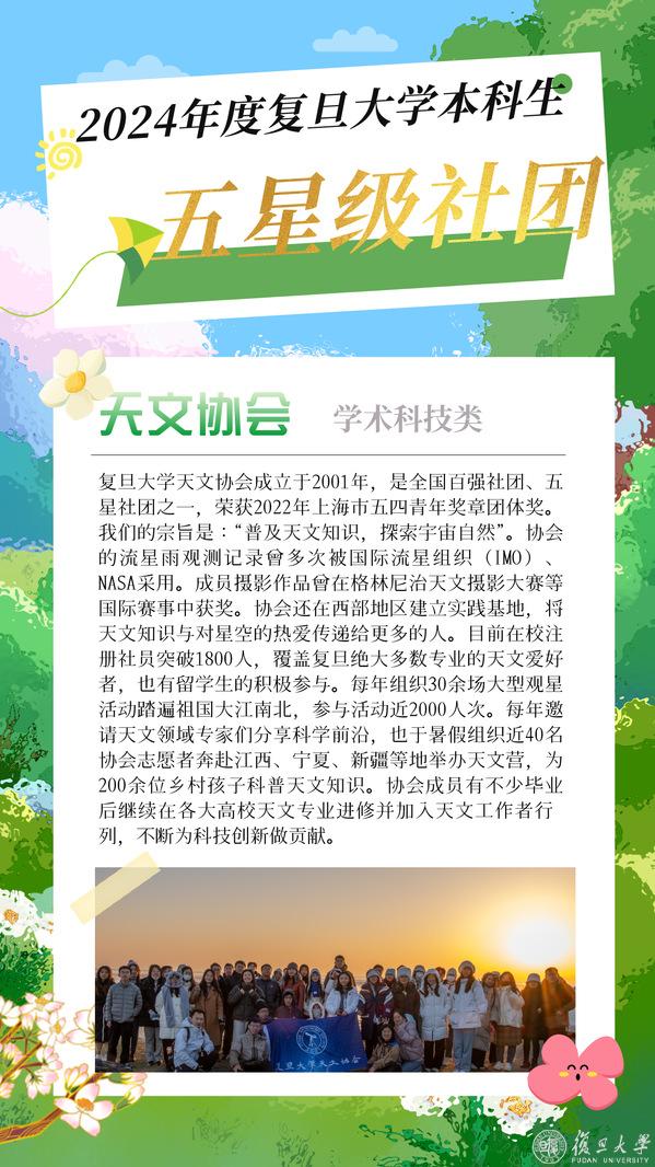 大学新生即将入学,在复旦园,要不要加入社团?加入哪个社团?“百团大战”时光草上涌动的人潮,暑期实践地支教队员们忙碌的身影。在复旦,数百个社团百花齐放,美好大学生活的具象在社团中闪闪发光。五彩斑斓的社团文化生活等新复旦人来探索。日前2024年度本科生星级社团揭晓,一起来看看2024年度复旦大学本科生五星级社团的风采吧!或许,就有令你心动的一支。