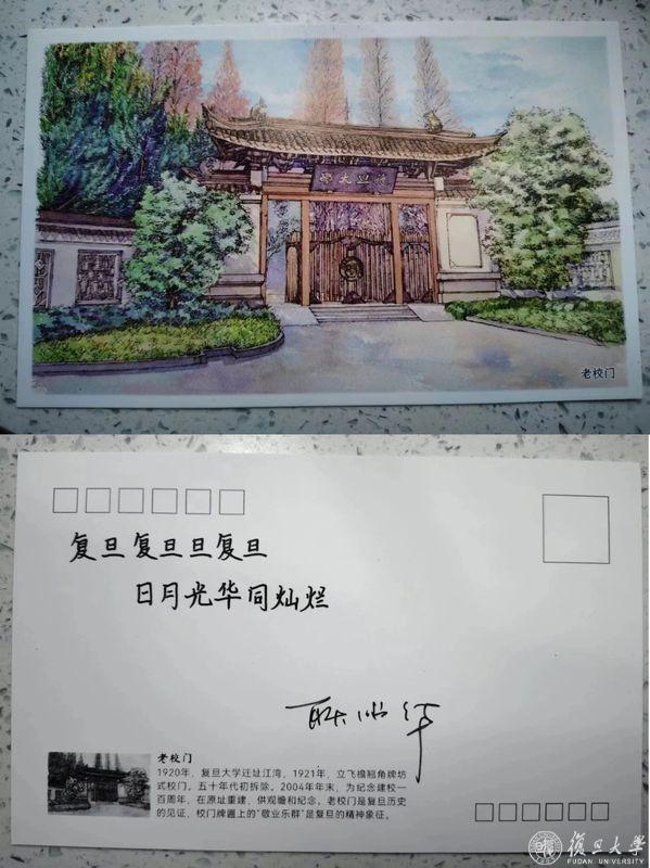 临走时,她收到耿昭华送来的一张复旦明信片,正面手绘的老校门在一片葱葱绿意间矗立着,背面是一句校歌:“复旦复旦旦复旦,日月光华同灿烂”。