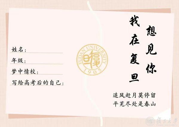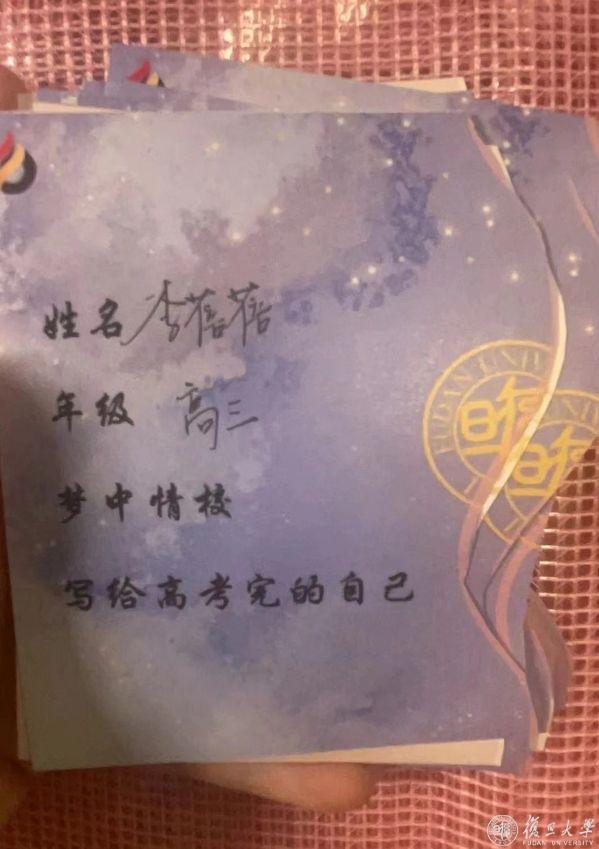 临走前,学姐递给她一张一分为二的心愿卡,左边写着姓名、梦想学校和写给高考后自己的话,右边写着“我在复旦想见你”。“如果高考后心愿达成,则重新合二为一”,学姐笑着对她说。