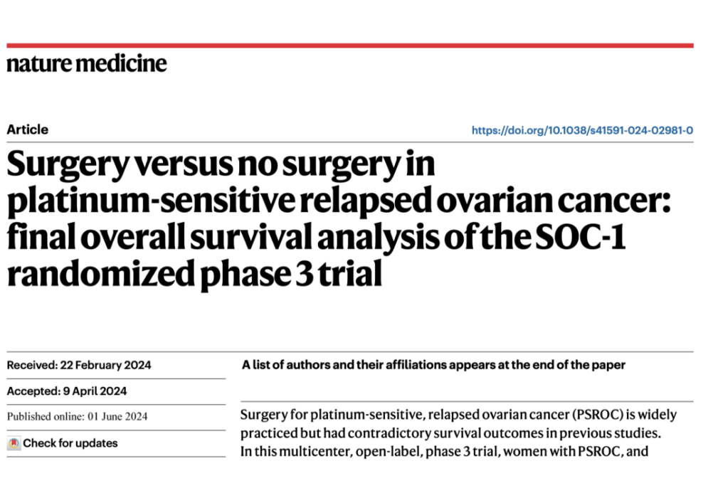 6月1日,附属中山医院臧荣余教授团队,联合浙江省肿瘤医院朱笕青教授、中山大学肿瘤医院刘继红教授团队,以快速报道形式在Nature Medicine杂志在线发表了题为“Surgery versus no surgery in platinum-sensitive relapsed ovarian cancer: final overall survival analysis of the SOC-1 randomized phase 3 trial”的国内多中心研究(SOC-1)的最终结果,美国肿瘤学年会同步会议报告。